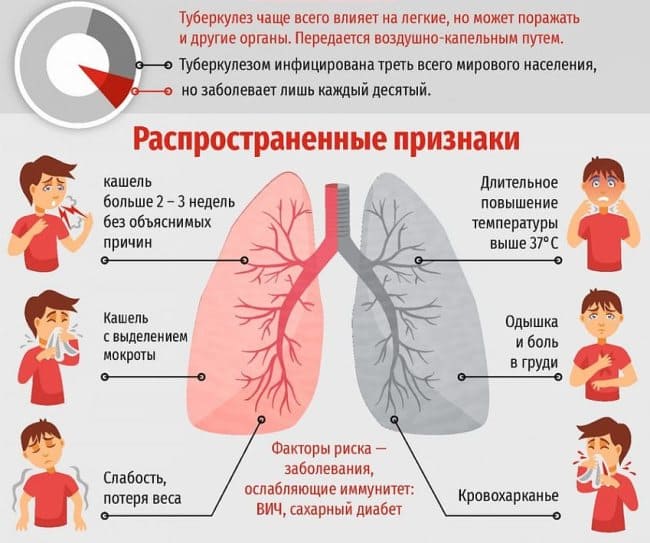 Кроме того, риск развития туберкулеза повышается при хронических заболеваниях легких, опухолях крови, других злокачественных новообразованиях, при почечной недостаточности с постоянным проведением гемодиализа, инсулинпотребном сахарном диабете и общем истощении.