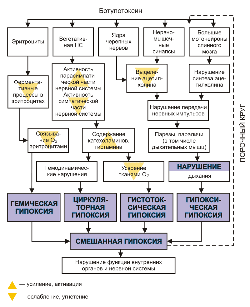 • Особенность активации ботулотоксина - под действием протеолитических ферментов (либо своих, либо в жкт), в результате чего нейротоксин (ботулотоксин) делится на 2 цепи: Н-цепь обеспечивает крепление токсина к рецептору клеточной мембраны, за счёт связывания с синоптической мембраной нервно-мышечных холинергических синапсов (соединений), иннервирующих поперечнополосатую и гладкую мускулатуру. L-цепь оказывает блокирующее действие на холинергическую передачу путём расщепления специфических синаптических белков (SNAP-25 и синаптобревин – аналогично, как при столбняке), нарушается связь синоптических пузырьков с пресиноптической мембраной, возникает блокада прохождения нервного импульса при нормальной продукции ацетилхолина и холинестеразы.